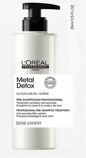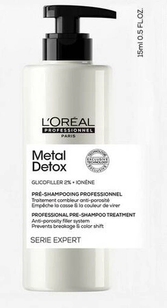 Dogłębnie oczyszczający przedszampon L'Oréal Professionnel Metal Detox Professional Pre-Shampoo Treatment to idealny produkt do pielęgnacji farbowanych i rozjaśnianych włosów, które często są bardziej porowate oraz mają większą skłonność do wchłaniania metali, co zwiększa ich łamliwość. Niewidoczne cząsteczki metali często znajdują się w wodzie oraz w samych farbach do włosów. Formuła szamponu Metal Detox została wzbogacona o 2% glikoaminy, która zauważalnie zmniejsza porowatość i łamliwość pasm, nie wpływając w żaden sposób na efekt koloryzacji.